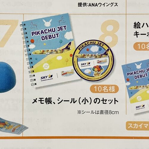 月刊エアライン 2021年9月号にて、ピカチュウジェットBCグッズのプレゼント企画。 ピカチュウジェットBCのメモ帳・シール。 ○ピカチュウジェットBCグッズ プレゼント スカイマーク提供のグッズ3セットのプレゼント。 メモ帳、シール(小)のセット 10名絵は…